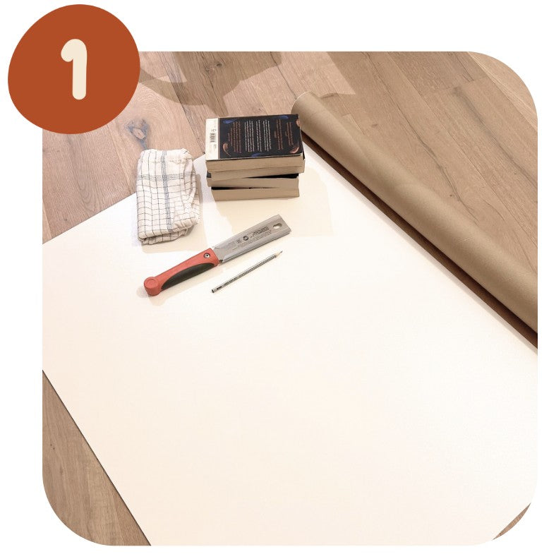 Læg derefter MDF-pladen på gulvet med den laminerede side opad. Sørg for, at pladen er fri for støv og snavs, og fastgør kridttavlen!
